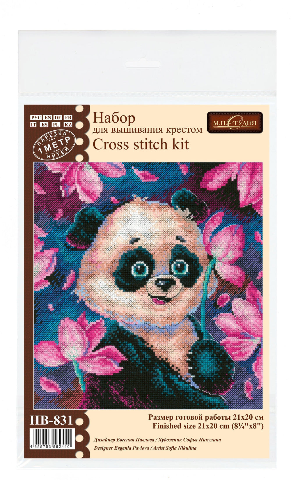 Le kit de point de croix « Panda romantique » de MP Studia présente une adorable image d'un panda entouré de fleurs roses. La combinaison de couleurs vives et le fond sombre soulignent le charme du design.