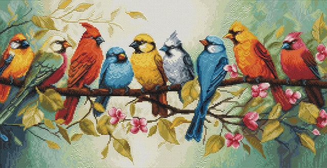 Ce charmant kit de point de croix présente un éventail coloré d'oiseaux perchés sur une branche fleurie, capturant une scène naturelle sereine avec beaucoup de détails. Il est idéal pour les amateurs de motifs naturels et d'oiseaux, avec un motif vibrant qui allie des tons chauds et froids.