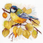 Une scène d'automne délicate et vibrante : un oiseau coloré perché parmi des feuilles dorées, parfait pour ceux qui aiment les détails naturels et le charme de la saison.