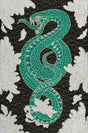 Motif fantaisie oriental : Un serpent émeraude enroulé sur fond noir avec des fleurs et des vagues dorées dans le style japonais.
