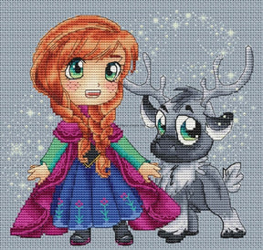 Personnages du dessin animé La Reine des Neiges dans ce schéma au point de croix compté des Petites Croix de Lucie. Le graphisme "Ana et Sven" est parfait pour décorer une chambre de fille.