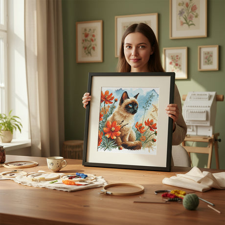 AVA P172 – The Cat’s Garden | Kit de punto de cruz con gato siamés y flores