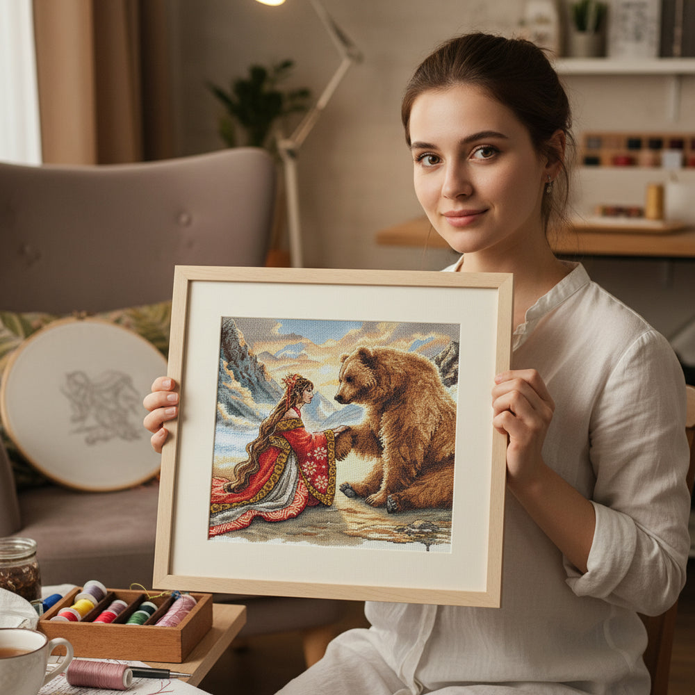 Plongez dans un conte magique avec le kit de point de croix Pacte d'amitié de la collection AVA. Cette scène touchante entre une jeune femme vêtue d'un costume traditionnel et un ours majestueux transmet force, douceur et connexion avec la nature. Idéal pour ceux qui cherchent à broder quelque chose de spécial et plein de symbolisme.