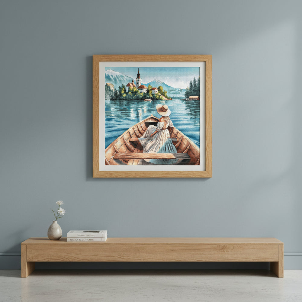 Descubre la magia y serenidad del kit de punto de cruz The Lady of Lake Bled de AVA, un diseño elegante que refleja la belleza del famoso lago esloveno con su isla y castillo. La escena muestra a una dama en un bote contemplando el paisaje, una composición llena de romanticismo y detalle artístico. Perfecto para bordadores que buscan un proyecto inspirador y decorativo.