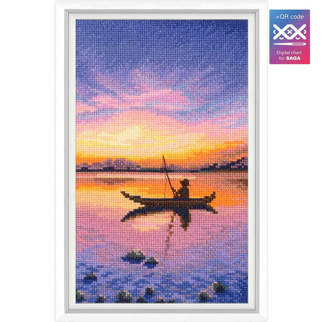 Plongez dans la sérénité d'un lever de soleil solitaire avec le kit de point de croix « Seul avec l'aube » de RTO. Ce design capture la paix absolue d'un pêcheur solitaire naviguant, entouré d'un ciel aux nuances de rose, d'or et de violet qui se reflètent doucement dans les eaux calmes.