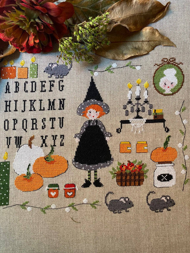 « Potions, sorts et confiture de citrouille » est un schéma de point de croix compté en couleurs représentant des personnages d'Halloween.
