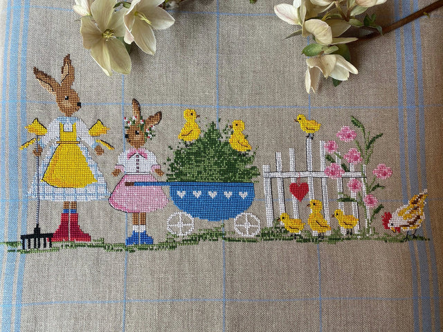 Schéma de point de croix compté avec motif de Pâques, idéal pour personnaliser les torchons de cuisine et autres textiles de maison.
