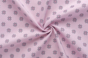 Le tissu présenté a un ton rose doux et délicat, qui pourrait correspondre au « rose délicat » mentionné dans la description. Le fond rose sert de base à un motif répétitif et symétrique qui semble être une représentation stylisée de fleurs ou de croix. Ces figures sont présentées dans des couleurs contrastant avec le fond, offrant une esthétique subtile et harmonieuse.
