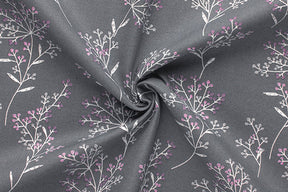 Ce tissu affiche un motif botanique de branches et de feuilles délicates. Le design se distingue par les lignes blanches ou très claires qui soulignent les formes botaniques. De plus, il y a des touches d’une couleur rose délicate dans certaines fleurs et feuilles, ajoutant un accent de couleur et de féminité au design global. Ces touches de rose peuvent être une représentation du « rose délicat » mentionné dans la description.