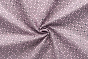 Ce tissu présente un dessin géométrique similaire à celui des autres tissus, mais cette fois, il est présenté dans des tons de rose ou de mauve pâle, avec des lignes diagonales formant une grille et des points blancs aux intersections. La palette de couleurs est douce et donne une sensation de chaleur et de sophistication.