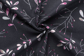 Le tissu "TIMELESS" de la marque Gütermann présente un design sophistiqué avec des motifs floraux et feuillus dans des tons délicats de rose, de gris et de blanc sur un fond sombre. Ces éléments s'entrelacent harmonieusement, offrant un motif frais et élégant.