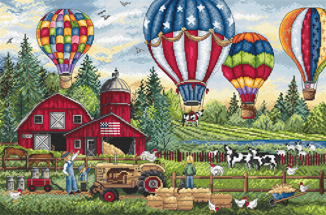 Le kit de point de croix LETISTITCH « Up, Up and Away » est une merveilleuse opportunité pour les amateurs de broderie de recréer une scène rurale américaine charmante et animée. Ce dessin, qui se distingue par ses détails et ses couleurs, représente une ferme avec des vaches et des poulets paissant paisiblement, un tracteur travaillant dans les champs et des montgolfières flottant dans le ciel, ajoutant une touche de magie et d'aventure à l'ensemble.