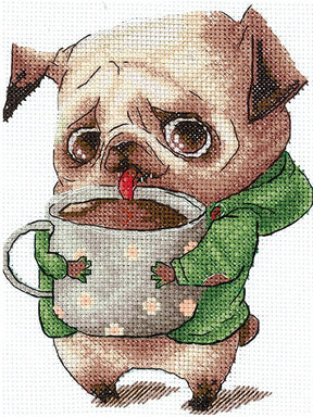 Un adorable kit de point de croix intitulé « COFFEE LOVERS. PUG » SANK-63. Ce kit comprend tous les éléments nécessaires pour commencer à broder une charmante image d'un carlin aux yeux expressifs, tenant une tasse de café, ce qui le rend parfait pour les amateurs de café et de chiens.